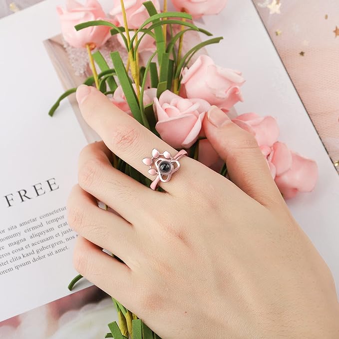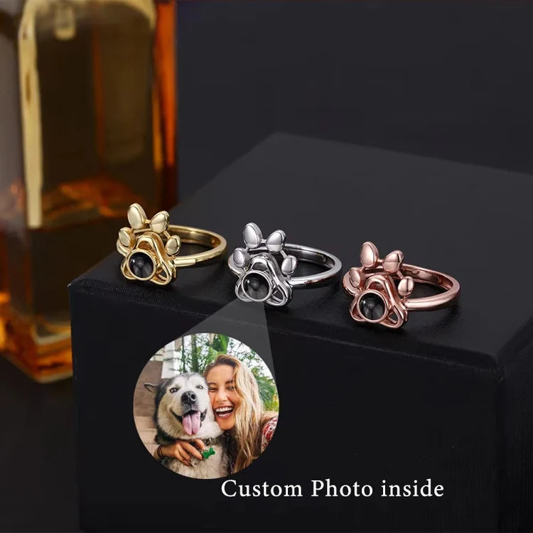 Our custom paw projection ring lets you preserve a special moment by featuring a photo of your furry friend inside the ring.